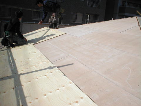 屋根の野地下地に断熱パネルを貼っているところです。